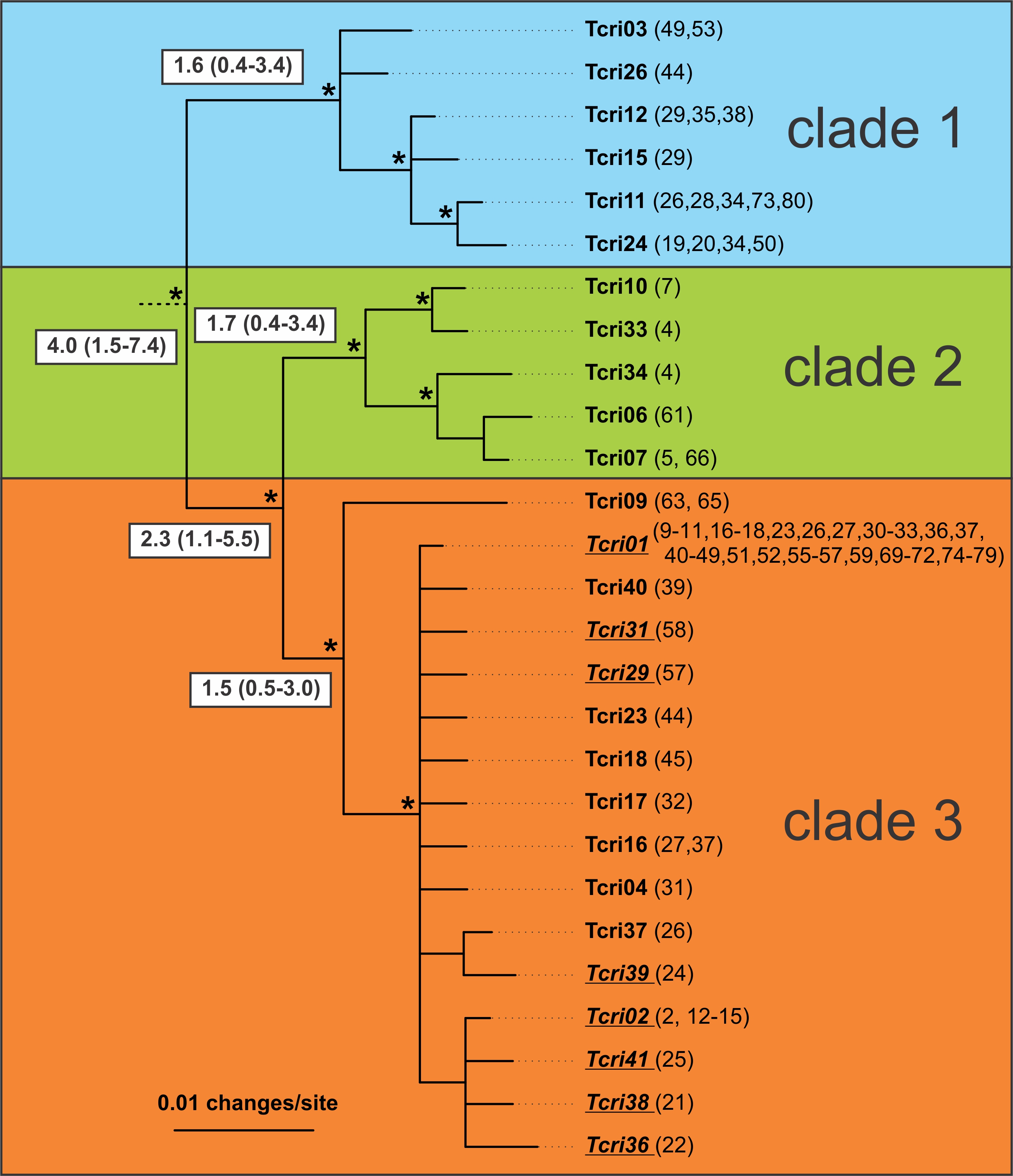 – Why is Tcri01 (orange clade) designated as a blue clade in the map figure 1B? Numbers 19 – 28 – 34 – 50 – 53 – 73 – 80 are all blue when they should have been orange to my opinion.